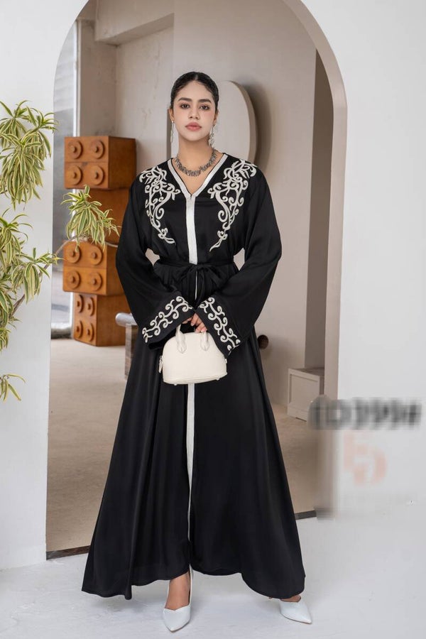 Hele mooie elegante jurk voor iedere gelegenheid. Met mooie versiering (tarz) op de borst en handen. Met centuur.